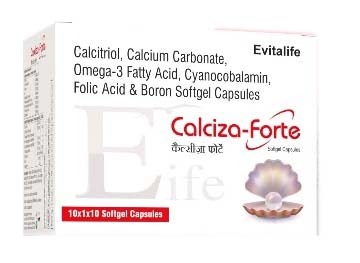 CALCIZA-FORTE combines Calcitriol and Calcium Carbonate for strong bones and teeth, while Boron supports bone mineralization. Omega-3 fatty acids promote heart and joint health, and Cyanocobalamin (B12) and Folic Acid aid in blood formation, nerve function, and metabolism. The softgel form ensures enhanced absorption and easy administration, making it suitable for adults needing bone, cardiovascular, and metabolic support.