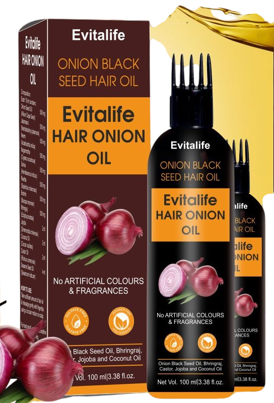 EVITALIFE Hair Onion Oil is an Ayurvedic herbal formulation specially developed to tackle common hair issues such as hair fall, thinning, dandruff, and slow hair growth. Enriched with Red Onion Oil, known for its high sulfur content that promotes collagen production, and Black Seed Oil (Kalonji), which is packed with antioxidants and essential fatty acids, this oil nourishes hair from root to tip. Regular use strengthens hair strands, stimulates healthy growth, adds shine, and keeps the scalp healthy. Free from mineral oils, parabens, and sulfates, it’s suitable for all hair types — men and women alike.