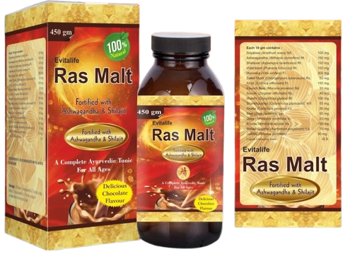 RAS MALT is an Ayurvedic herbal syrup formulated with a rich blend of medicinal herbs, fruits, and minerals. Ingredients like Ashwagandha, Shatavari, Safed Musli, and Shilajit help enhance vitality and stamina, while Amla, Giloy, and Bael support immunity and overall wellness. Other herbs like Kaunch Beej, Gokhru, and Arjuna aid reproductive and cardiac health. This formulation is ideal for adults seeking natural support for energy, immunity, and general health.