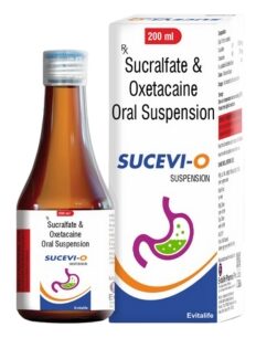 SUCEVI-O Oral Suspension combines Sucralfate, which forms a protective barrier over ulcers and irritated gastric lining, with Oxetacaine, which provides rapid local pain relief. This combination helps heal ulcers, reduce acidity, and relieve burning sensation and discomfort in the stomach and esophagus.